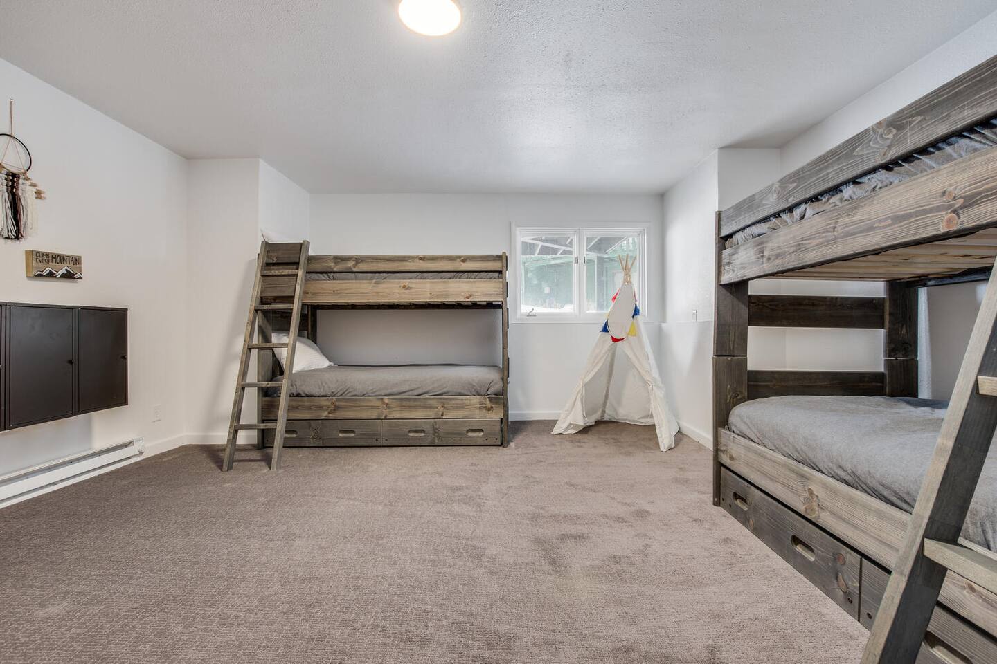 Main Level: great room with living area, 12-person dining table, kitchen with breakfast bar and 36" range, king bedroom with en-suite bathroom, king bedroom, hall bathroom. Upper Level: tv loft with sectional, desk, two king bedrooms, one hall bathroom. Lower Level: king bedroom, bunk room with six twins (four bunks and two trundles), two hall bathrooms, family room with tv, pool/ping pong/dining table, another full kitchen, laundry room. Parking: two-car garage, space for four more cars. EV charger. Outdoor: hot tub, covered deck with grill and four-person table, dining deck with 8-person table, front deck with Adirondack chairs.
