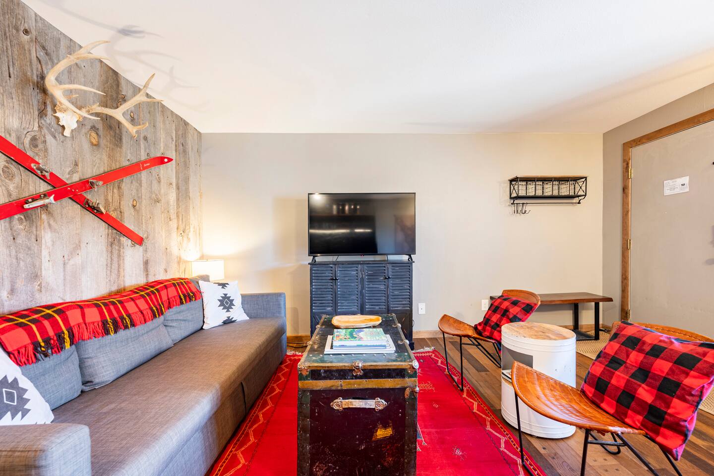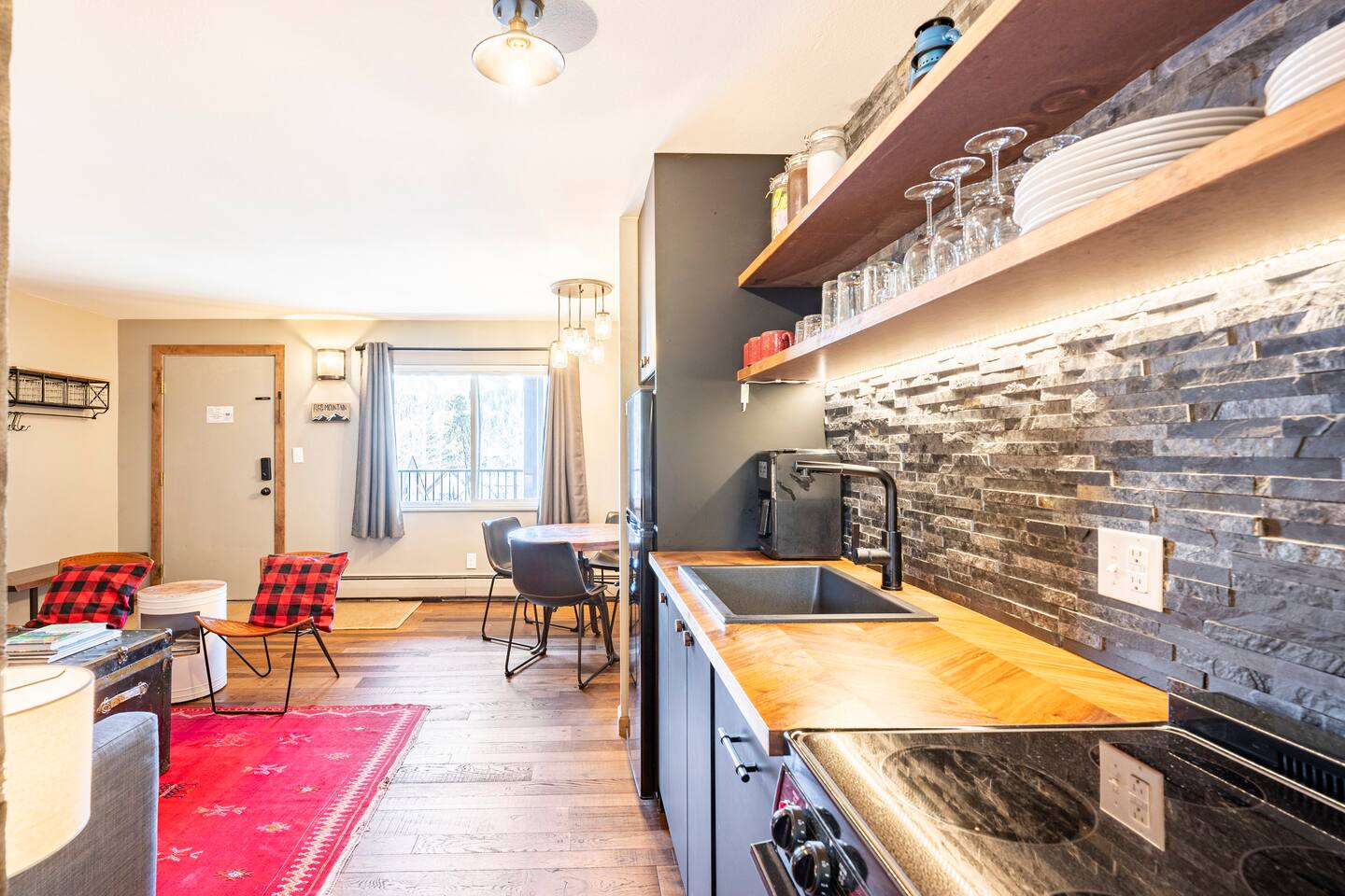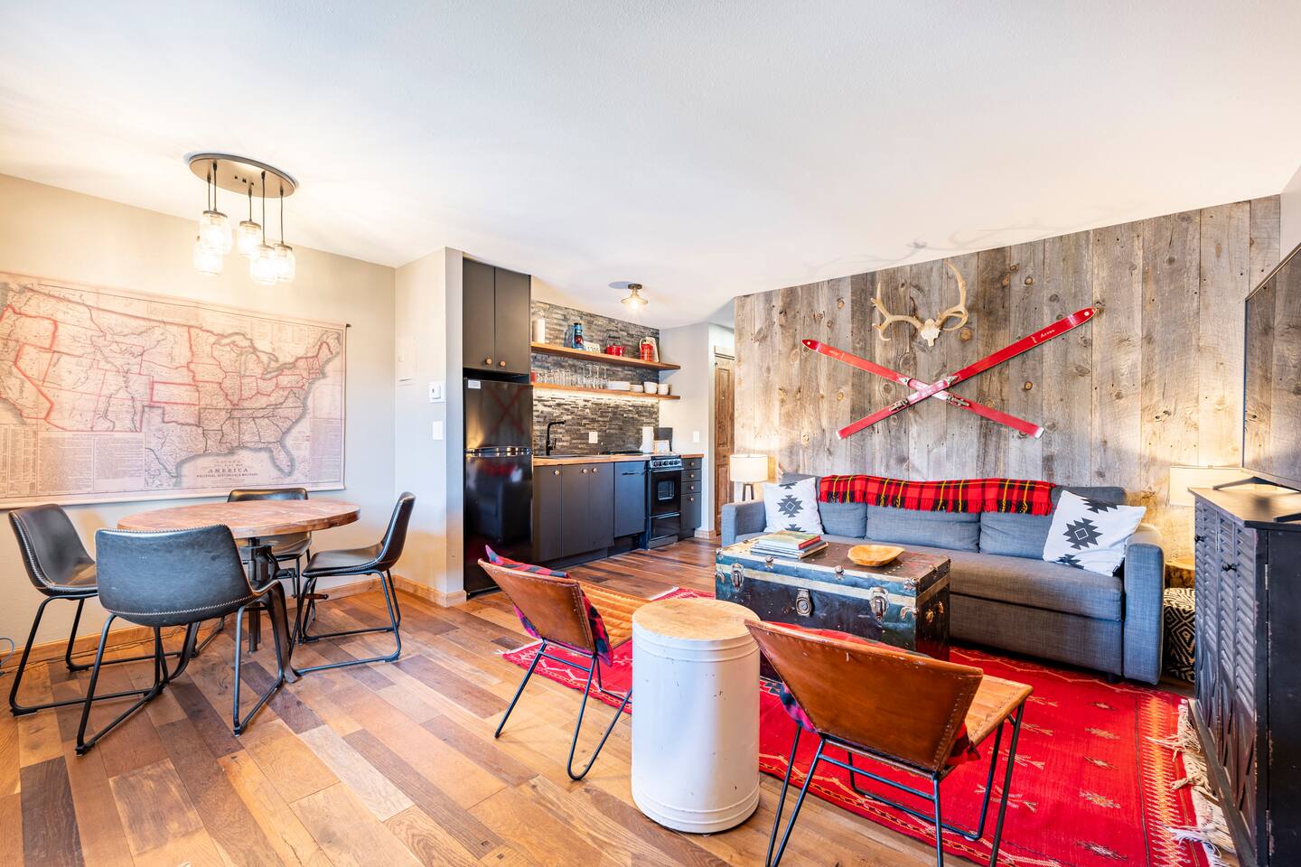 Freshly remodeled in a hip modern mountain style, our condo is in the heart of Breck. Wake up to views of the sun hitting the ski area. Gear up walk about a block across Main Street and to the gondola. At the end of the day, come home to the comfy couch (which also converts to a bed), watch a movie on the smartTV and cook up a full meal or hit one of the nearby restaurants. At the end of the night, the comfy King bed will leave you ready for your next day of adventure.
