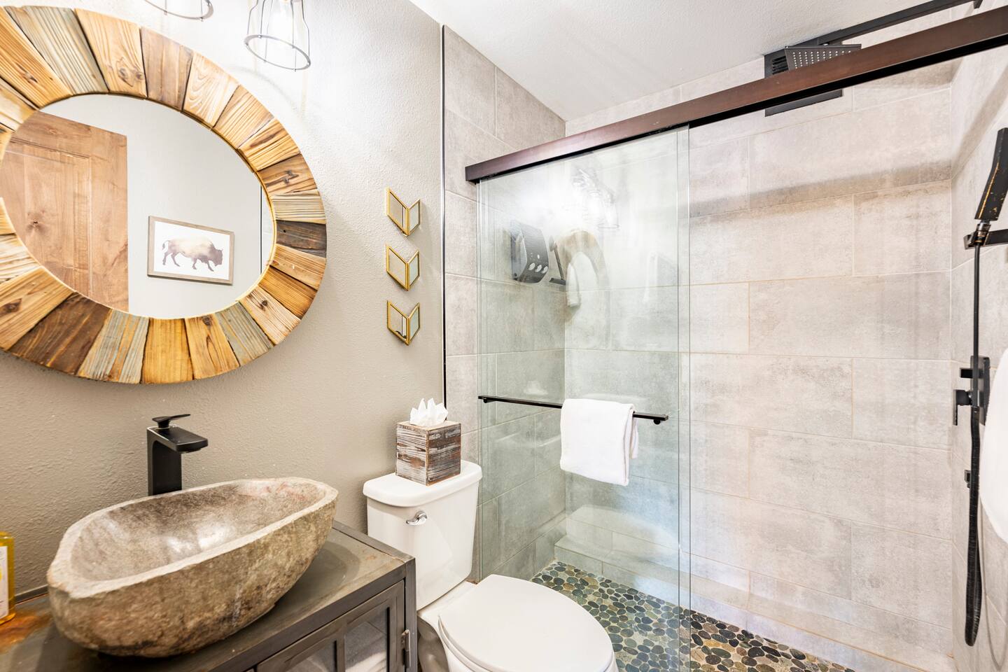 Our home has a large great room with pull-out sofa, chairs, a four-person dining table. The open kitchen has everything you need to cook a full meal including dishwasher and microwave. We provide drip coffee and all the essentials. The bathroom has a cool rock sink and large shower. The bedroom has a comfy king bed and closet.